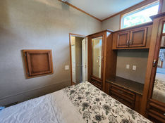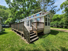 Enjoy lake views from the spacious railed deck on this 2017 Kropf Lakeside one-bedroom park model. Plentiful windows adorn all sides of this upscale unit, creating a cheerful atmosphere inside your new home-away-from-home. Nutmeg finish cabinetry, faux plank floors, and natural wood blinds enhance the cabin feel. The kitchen includes stylish black appliances, tiled backsplash and stainless steel fixtures. The bathroom contains a large tub/shower and house-type flush toilet. Some special features include upgraded linoleum and carpeting, a 55,000 BTU upright furnace, and split-system AC unit. Floorplan also features a second entrance near the master bedroom. Plenty of storage throughout. Additional items include various kitchenware & small appliances; vacuum cleaner; an indoor TV antenna; linens; grill; patio table with umbrella and a utility wagon. Shed, wood rack and two 100# LP tanks also included. Large, grassy corner site.